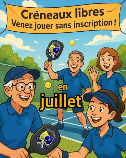Ce mois de juillet, venez tester le pickleball avec nous. Initiation gratuite et prêt de matériel (raquettes, balles, filets). Rendez-vous - jeudi 3/07, de 18 h 30 à 21 h 30, - les lundis 7, 14, 21 et 28/07 de 18 h 00 à 21 h 30, - et les mercredis 9, 16, 23 et 30/07, de 18 h 30 à 21 h 30. Lieu : City du Palais des sports de la Coudoulière, rue Curet-Bas à Six-Fours-les-Plages. À très vite.